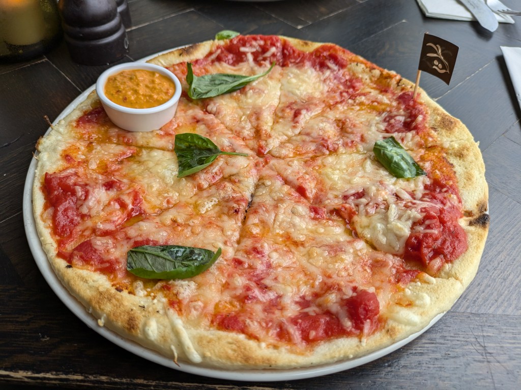 Bergen being a city meant that I had more gluten-free options than other towns and villages I visited. We opted for lunch at Olivia’s – an Italian restaurant which was well-reviewed by fellow coeliacs. Most dishes can be done gluten-free, and I went for a gluten-free margarita pizza with vegan cheese and a chilli dip.